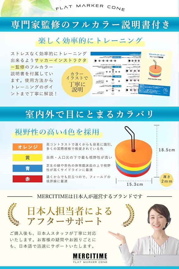 【つまずきにくいフラット形状を採用】従来のコーン型のマーカーと異なり、フラットな形状を採用することで、つまずきや転倒のリスクを大幅に軽減しました。お子様やシニアの方でも安心してトレーニングに取り組めます。また、ボールが当たってもイレギュラーバウンドしにくいため、集中して練習に取り組めます。