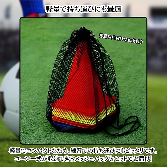 【軽量で持ち運びに便利】軽くてコンパクトなため持ち運びも楽々!コーン一式が収納できるメッシュバッグが付属するため、収納時や持ち運びの際も便利にお使い頂けます。日々の練習のお供として、是非ともお役立て下さい。