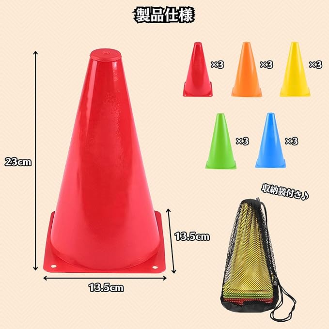 【製品仕様】<内容> コーン本体セット、収納袋1個 <サイズ> 高さ:8cm/18cm/23cm 幅:7.5cm/13cm/13.5cm <カラー> レッド、ブルー、イエロー、グリーン、オレンジ