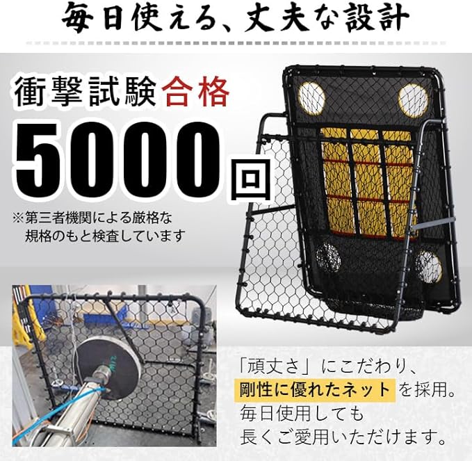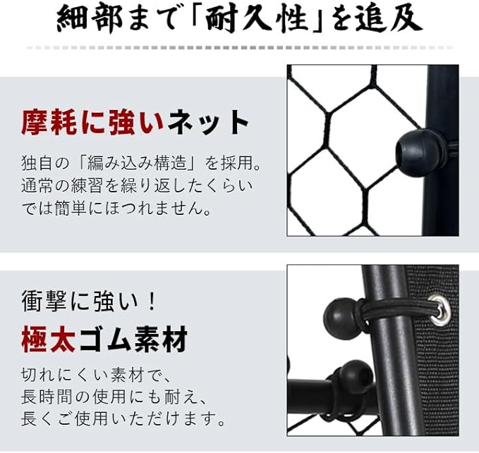 【丈夫な設計】⚾耐久性も抜群。「頑丈さ」にこだわった、剛性に優れたネットを採用。毎日使用しても、長くご愛用いただけます。また、ネットの形は衝撃に強い「ハニカム構造」です。ハニカム構造は、蜂の巣のような六角形のデザインで、四角形よりも優れた耐久性をもつのが特徴です。一般的にサッカーゴールでも採用されており、強度と耐久性が求められるスポーツ器具に最適なのです。