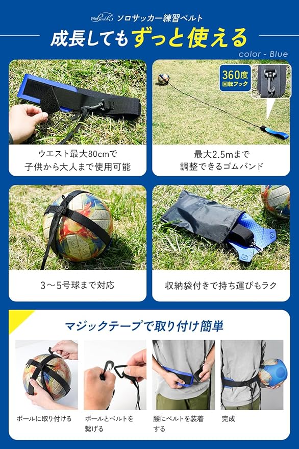 ⚽【商品の特徴】 伸縮性と耐久性のあるゴムバンド: 長くご愛用いただけます。 マジックテープで簡単取り付け! 幅広くゴムバンドの長さ調整が可能! 従来商品より最大で2.2m長く、様々な練習に対応できます。 360度回転するフック: 様々な角度からのボール返しに対応。 サッカーボールに対応: 4号球、5号球に対応。 屋外での練習も可能: 柔らかいボールに使え、様々なシーンで活躍します。 収納袋付き: コンパクトに収納でき、持ち運びも楽々。