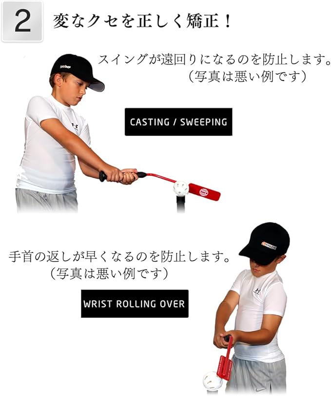 スイングして、バットがボールに当たっているときのバッターの手首の返りが早くなるのを防ぎ、適正に矯正します。