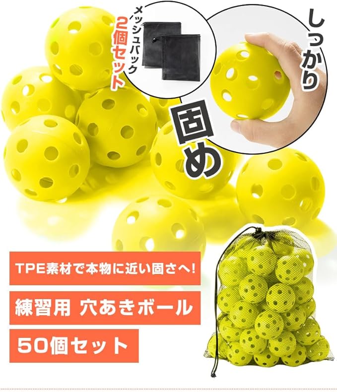 野球 バッティング練習用 ボール 穴あきボール 専用メッシュバッグ付き TPE素材 室内 トレーニングボール 軽い 室内練習 おもちゃ 野球ボール【イエロー】