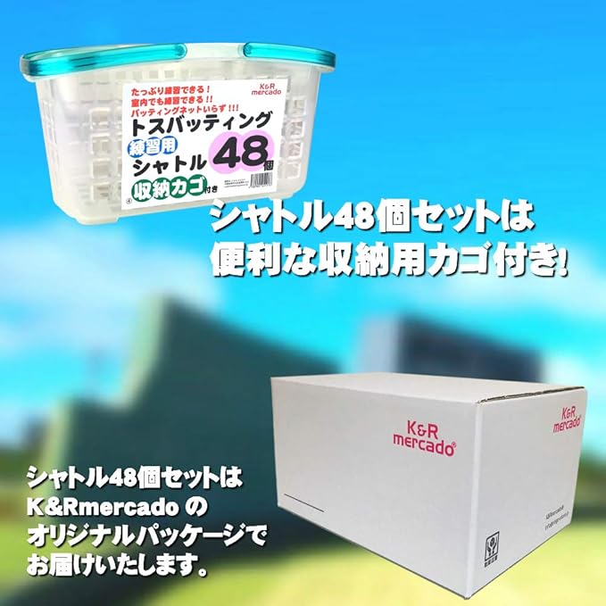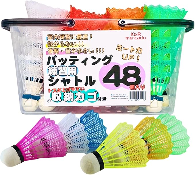 大容量48個入り。 そのうえ【収納用カゴ】もセットです。羽根を拾うときもカゴを使えば効率的!トスを上げるときも袋などとは違いカゴの方が取り出しやすく、トスも上げやすい。野球・ソフトボールなど競技に関係なく使用可能。