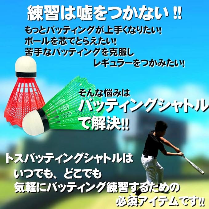 トスバッティングシャトルは 集中力・ミート力・打撃力・動体視力・芯で球を捉える能力を鍛えます。雨天時の自宅や室内練習にも最適です。 多くの有名プロ野球選手も子供のころから行っている練習法です。