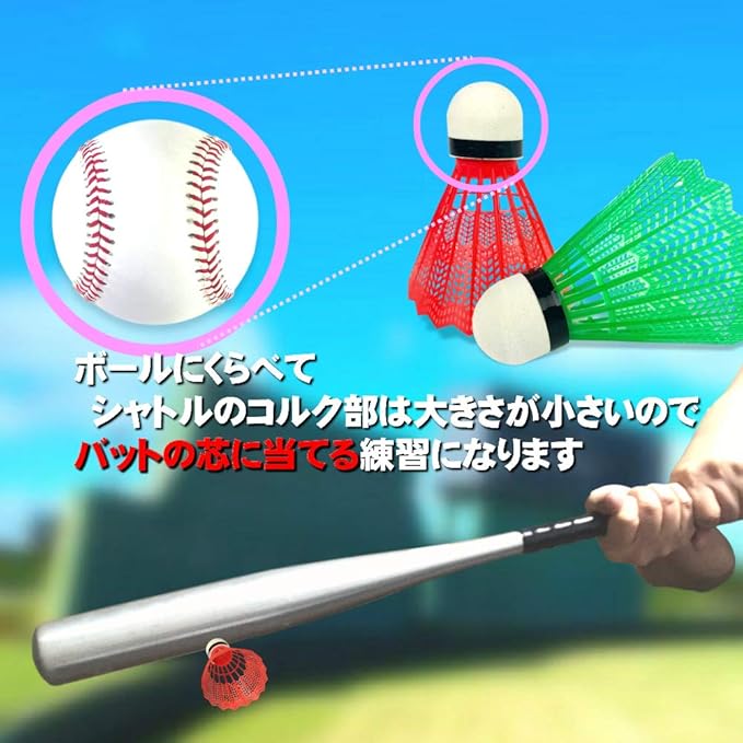 軽く羽の抵抗があるので遠くまで飛びません。転がらないので扱いが楽!カーテンなどに向けて撃てば音も少なく近所迷惑にもなりにくいです。 バッティング ネット不要。コルク部はやわらかい発泡素材です。
