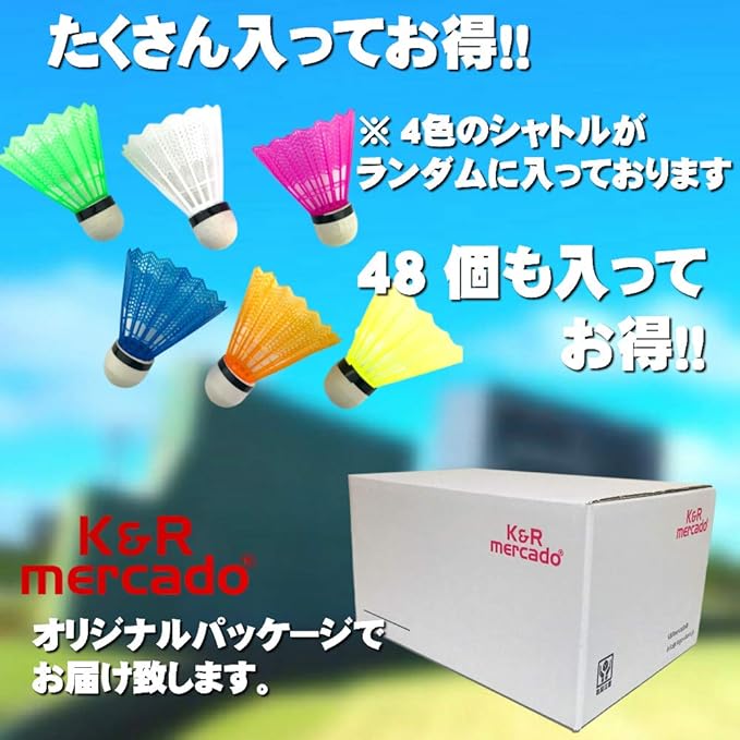 【セット内容】シャトル48個、収納カゴ1個(28 21 H15cm) シャトル1個の重量:約4g 羽根:ナイロン製 コルク部:EVA発泡素材 自動シャトルマシーン使用不可。注意:練習の際は周囲の状況を確認し安全を確保したうえでご使用ください。