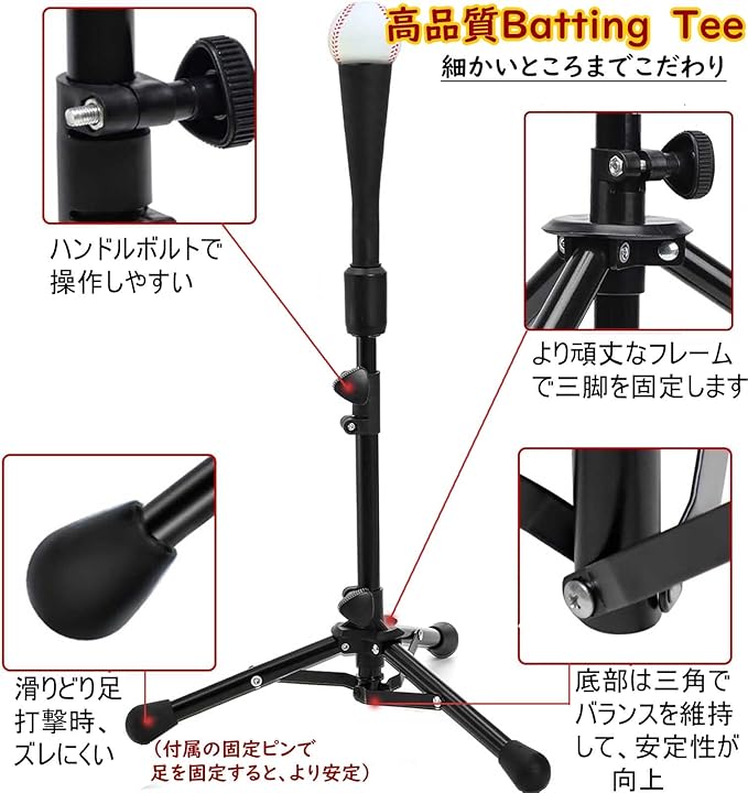 【耐久性と安定性】バッティングティーは高品質の頑丈なスチールチューブフレームと頑丈なスチールチューブフレームを採用しており、錆や変形等の事が発生しません。三脚タイプで安定感が良い。その上、三脚固定用ピン(押さえピン)を3枚付属しているので、芝と土などに固定すれば、練習中に偶にスタンドを打っても倒れることの心配が要りません。少し風があっても練習続けます。