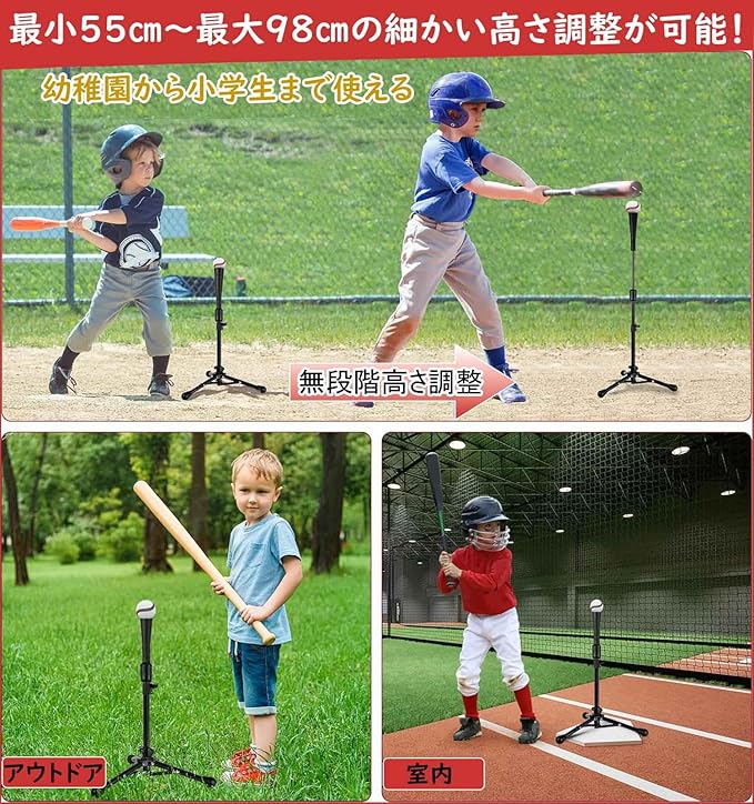 【最小55cm~最大98㎝まで幅広く調整可】野球練習ティーの高さ範囲は55cm-98cmで、55cmは子供に適しており、98cmは大人とティーンエイジャーの練習ニーズに適しております。身長やストライクゾーン、苦手なコースなど、使う人に合わせて最適な高さ調整が可能!お子様から大人まで、手軽に自主練習ができるバッティングティーになります。