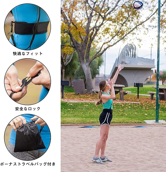 場所を選ばず一人でサーブ練習ができるバレーボール用品「サービストレーナー」。伸縮ストラップで打ったボールが戻るため、ボールを追いかける必要がありませんので、より長く練習できます。サーブを打つ感覚でスイング・打点の確認でき、部活動や試合前のウォーミングアップ等にも使用されます。