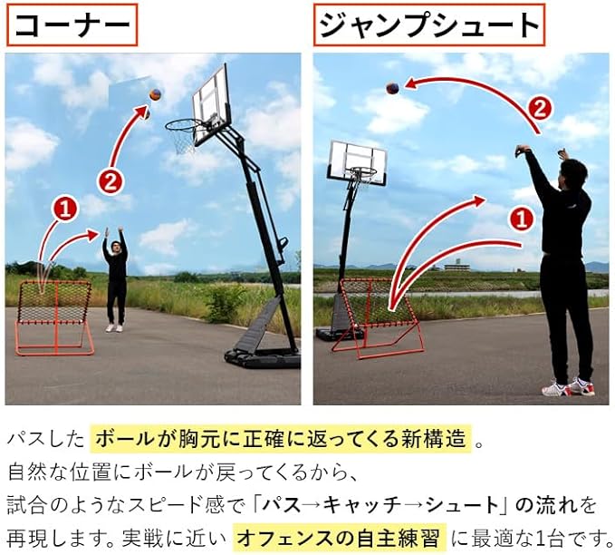【壁いらず、相手いらず】 一人でも“実戦パス”練習を実現。バスケットゴールと一緒に使えば、パス→キャッチ→シュート練習が可能。胸元に返球される構造のため次への動き出しがスムーズに行えます。体育館はもちろん、自宅練習にも対応した、個人スキルを伸ばすための新定番アイテムです。