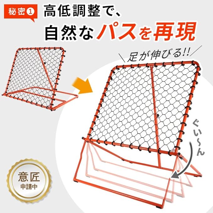 【角度・高さを細かく調整】 自然なパスを再現できる14段階構造。返球の角度は14段階、高さも自在に調整できるから、身長や練習目的に合わせたカスタマイズが可能。実戦のパス軌道に近い返球ができるため、よりリアルな練習が可能に。シュートまでの一連動作を繰り返すことで、試合勘もアップ!