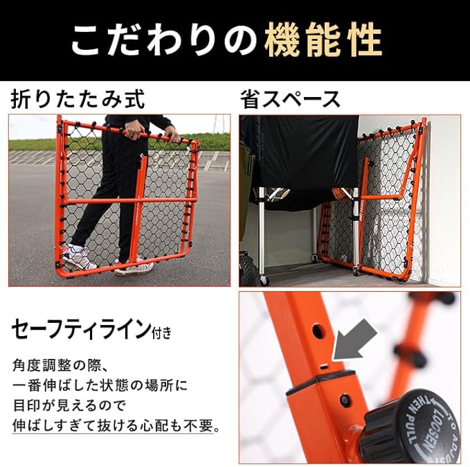 【折りたたみOK】 省スペース収納&持ち運びもカンタン。レバー操作だけで折りたためる簡単設計。使用後は省スペースに収納でき、車にも積み込みやすいサイズ感です。安全面にも配慮し、角度調整時に抜け落ちを防ぐセーフティライン付き。体育館や自宅、どこでもトレーニングが可能です。