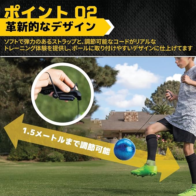 革新的なデザイン: ソフトで弾力のあるストラップと、約1.5メートルの調整可能なコードがリアルなトレーニング体験を提供し、ボールに取り付けやすいデザインに仕上げてます。
