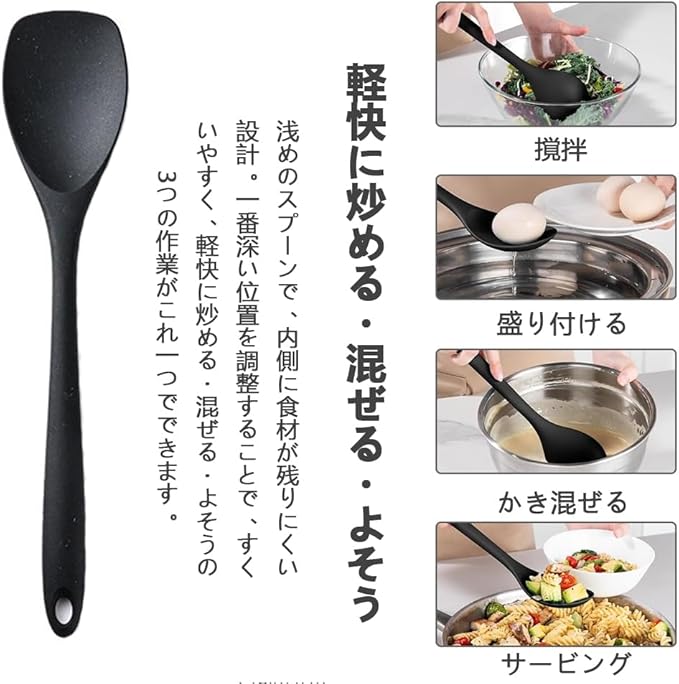 【柔らかい】鍋肌に沿ってしなるので、食材との間に入り受け止めやすい仕様です。 【ノンスティックフライパン】:シリコン製スプーンスパチュラの先端は柔らかいシリコン製で、焦げ付かないフライパンや鍋のコーティングに傷や損傷を与えません。 かき混ぜたり、混ぜたり、削ったりするのに最適なキッチンヘラです。 【コンパクトで炒めやすい形状】木べらのようなフラットな柄と、コンパクトな幅で小回りが効いて、炒めやすい形状です。一度にたくさん炒めるときも、操作しやすいちょうどいい長さ。 【軽快に炒める・混ぜる・よそう】浅めのスプーンで、内側に食材が残りにくい設計。一番深い位置を調整することで、すくいやすく、軽快に炒める・混ぜる・よそうの3つの作業がこれ一つでできます。 【お手入れ簡単】:ヘラは継ぎ目のないデザインで、食材やソースを引っ掛けません。 この調理用シリコーンスプーンは、お手入れが簡単で耐久性があります。 洗い流すか、食器洗い機に入れるだけで、毎回ピカピカになります。