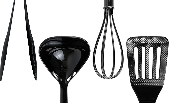 フライ返し、おたま、トング、泡だて器をセットにしたナイロン製オールブラックの限定商品アイテムです。