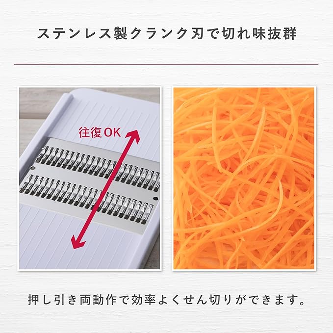 トンネル状のクランク刃を通すことで包丁で刻んだような、角のある美しい細千切り(つま程度の千切り)が簡単に仕上がります。