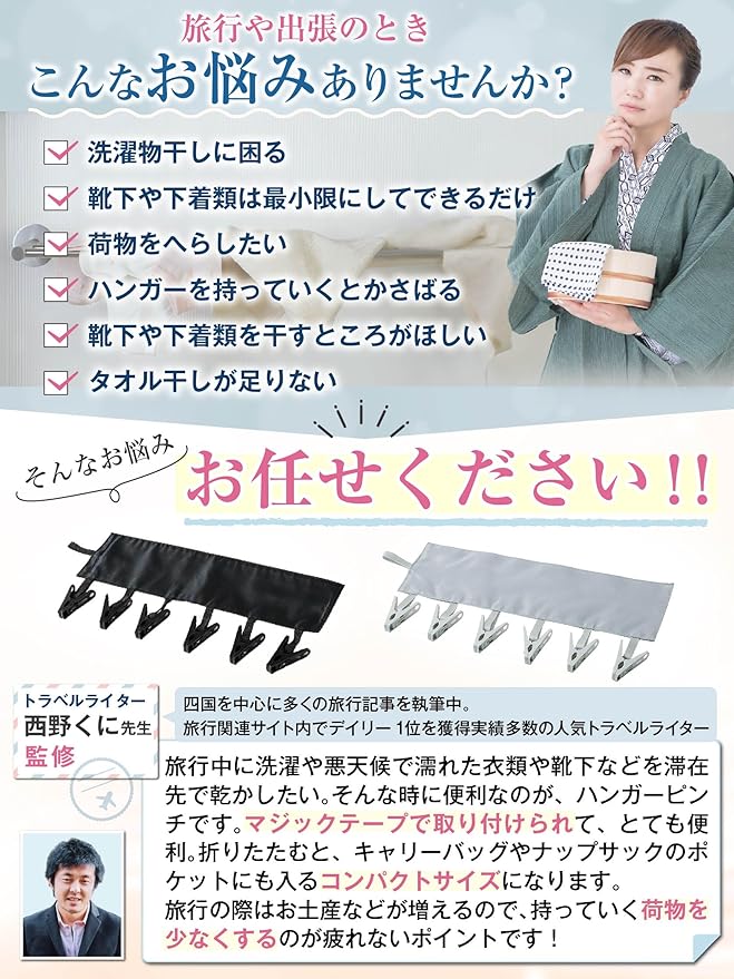 ・【旅行や出張の便利グッズ】旅行や出張時にくつ下、タオル、下着類などの洗濯物を干すための小物干しがあると重宝します。ハンガーを持っていくのは荷物が多くなり持ち運びが不便です。当ショップのハンガーピンチはコンパクトに折りたためて超軽量なので、持ち運びに便利!使い方もとても簡単!ハンガーなどに付けるだけで簡単に使えます。