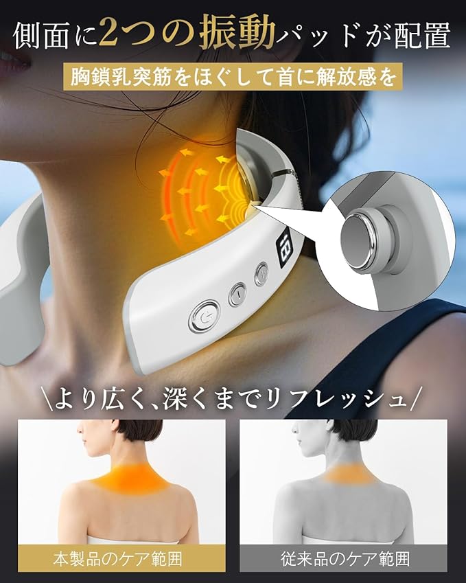 【広範囲を刺激】既製品に比べてもっと強く、気持ちいい“側方の「振動パッド」”を搭載。首の後方の「パルス・加熱パッド」と 首の側方の「振動パッド」で首周りをを広範囲にケアしてくれる!TENS EMSの両方の周波数のパルス波を組み合わせることで、振動とパルスで、僧帽筋(首を支えている筋肉)を刺激してほぐします。同時に首の側面の胸鎖乳突筋(肩の違和感に繋がる)に心地よい振動が届きます。従来品は襟足のみのケアでしたが、このリラクゼーション器のケア範囲は首の首の両側まで広がります。 ※EMSは筋肉を直接刺激し効果を与えるため振動するものではございません。両パットがしっかりと肌に触れた状態でのみ効果を感じられます。
