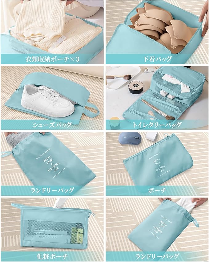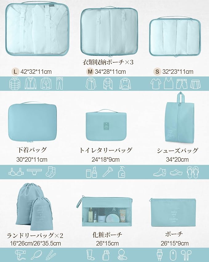 【トラベルポーチ 10セット】衣類収納ポーチ 4、掛け式トイレタリーバッグ 1、シューズバッグ 1、巾着袋 2、メッシュ化粧ポーチx1、ポーチx1。着ていない服衣類や汚れた衣類、洗面用具やシューズなども分けて衛生的に収納できます。スーツケースのなかもすっきりします