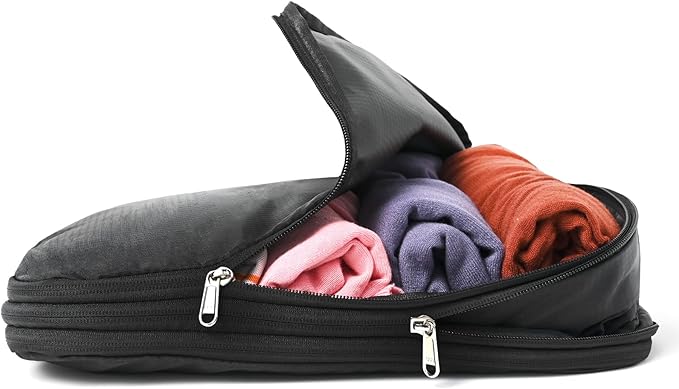 【ファスナーで簡単に圧縮】 旅行 中のかさばる荷物をスッキリ!TABIGO!!の圧縮ポーチは、畳んだ衣類を簡単に圧縮できます。トラベルポーチのファスナーを閉めるだけで、スーツケース内がスッキリまとまり、パッキングが楽になります。さらに、両側ポケット仕様により、着用前と着用後の衣類を分けて収納することができ、衛生的で効率的な使い方が可能です。コンパクトな収納と衣類の衛生管理を同時できる便利グッズです。