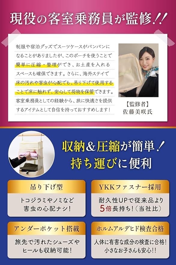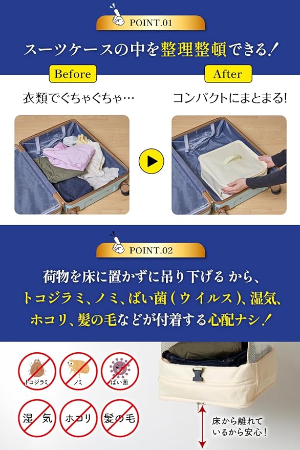 【耐久性UP!従来品より5倍長持ち】ファスナーには信頼と実績のYKK製品を採用しました!耐久性がUPしたことで従来品より5倍長持ちするようになりました(当社比)。 【吊り下げ型だからトコジラミやノミなど害虫の心配なし】「宿泊先でトコジラミやノミが気になって、衣類を床に置きたくない」という方に最適!床に置かずに吊り下げるクローゼットのため、トコジラミやノミなどに関しての心配は無用です。
