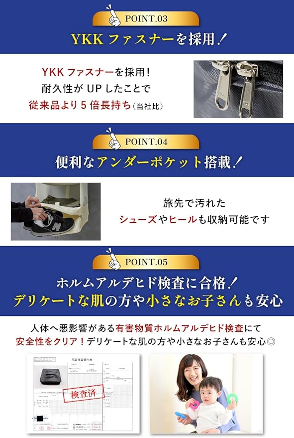 特徴 YKKファスナー, 吊るせる, 折り畳み式, 真空密封, 防湿性