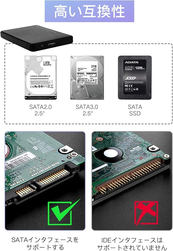 USB3.0エンクロージャは、2.5インチHDD / SSD、Mac Windows Linuxに対応しており、最大4TBまで対応しています。機械HDD、TLC NANDやMLC NANDのSSDに最適です!※USBをパソコンに接続後LEDインジケータが光ります、USB未接続の場合、LEDインジケータが光らないです。