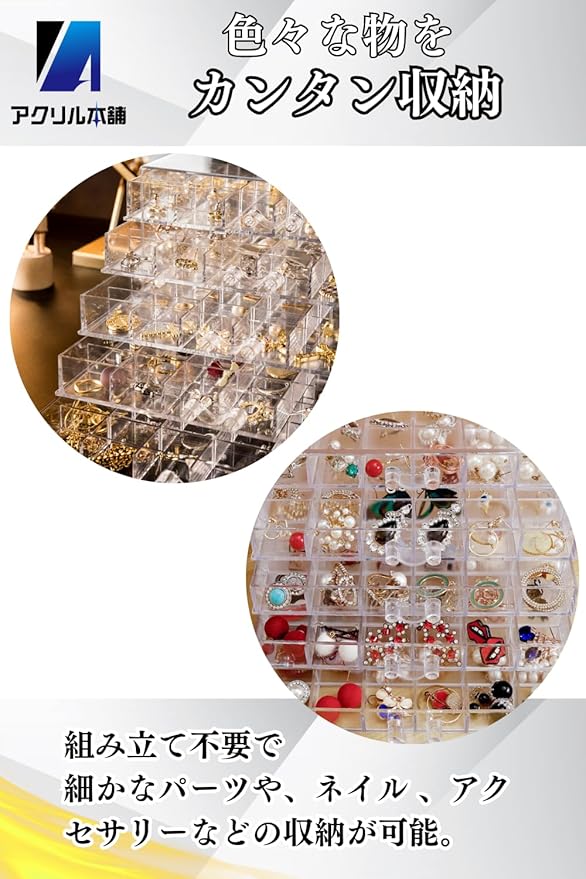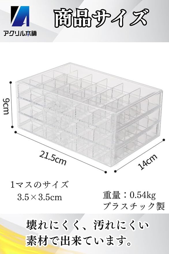 【仕切り付き収納ケース】アクセサリーなどの小物を収納するのに最適な引き出し付きキャビネットタイプ【色々な物をカンタン収納】引き出し付きなので収納が簡単です。また、透明なので何がどこにあるのか分かりやすい仕様になっています。【組み立て不要】組み立て不要で 細かなパーツや、ネイル 、アクセサリーなどの収納が可能。【商品サイズ】21.5 14 9㎝ 1マスのサイズ 3.5 3.5cm【重量】:0.54kg プラスチック製【日本限定商品ならではの安心サポート】 本製品は日本国内限定商品「アクリル本舗」のオリジナル商品です。お客様に安心してお使いいただけるよう、きめ細やかなサポート体制を整えております。万が一、輸送中の破損や初期不良がございましたら、迅速に対応させていただきますのでご安心ください。