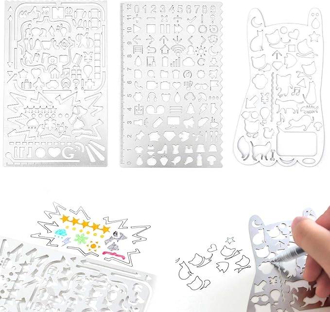 PAVIKE 金属 多機能定規 3枚 製図定規セット DIY描画 手帳用 図面テンプレート 学生や子供 おもしろ文房具