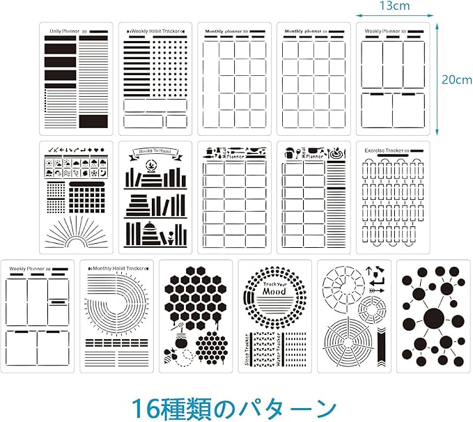 ジャーナルステンシルセット【16個セット】プラスチック製 再利用可能 DIYプランナーテンプレート 週刊誌 日記 手帳に最適 スケジュール ドローイング 20cm*13cm