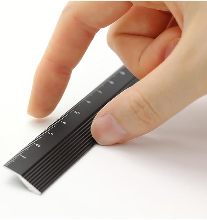 カッターにも強いアルミ製のシンプルな15cm定規。長く使っても消えないレザー刻印目盛り。