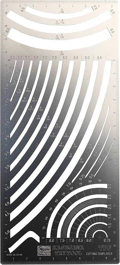 硬度の高いステンレスを精密に加工したカット用テンプレートです。粘着シートやシールを平行に切り出す「曲線平行幅」を集めたテンプレートBは、 模型に対応する曲線の細切りから太い幅の切り出しまで幅広く対応しています。フィニッシュシリーズのみならず、マスキングシートの切り出しや、定 規としても役に立つ、便利なテンプレートです。