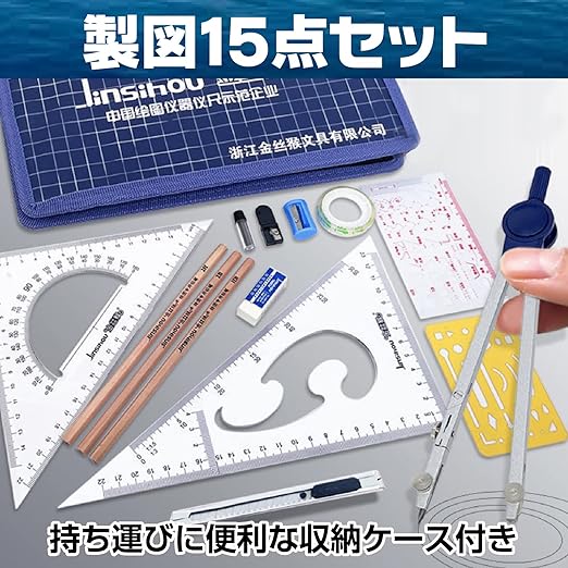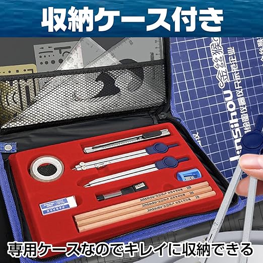 【商品仕様】 セット内容:大型三角定規、大型デバイダー 、大型コンパス 、鉛筆(2H,2B,HB) 、消しゴム、テープ、カッターナイフ 他。※定規のデザインは製造時期により多少の差異がある場合がございますので予めご了承下さい。 サイズ:(ケース)約16.5cm 27cm 2.5cm
