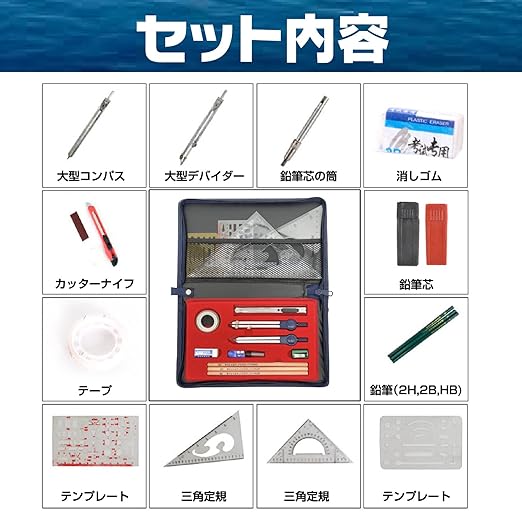 Saki&Masa 製図 海図15点 セット コンパス 三角定規 船舶 練習用