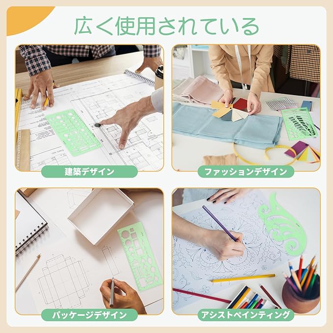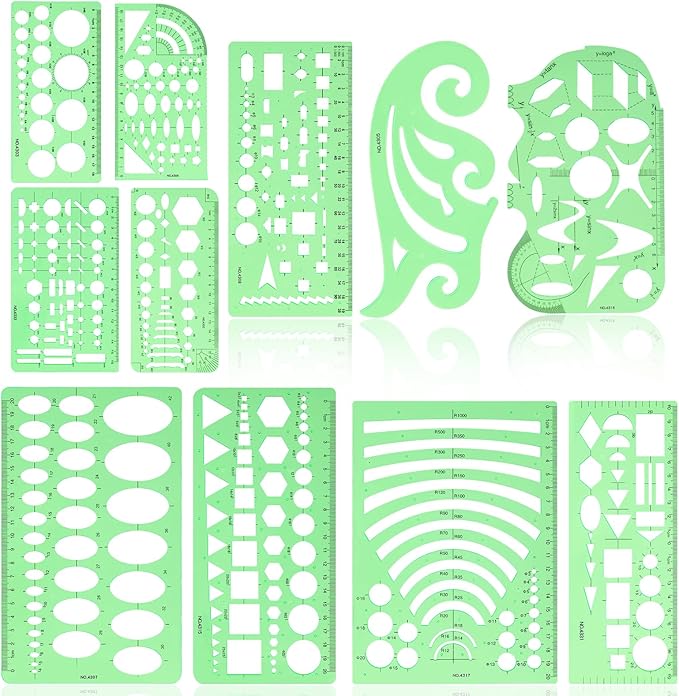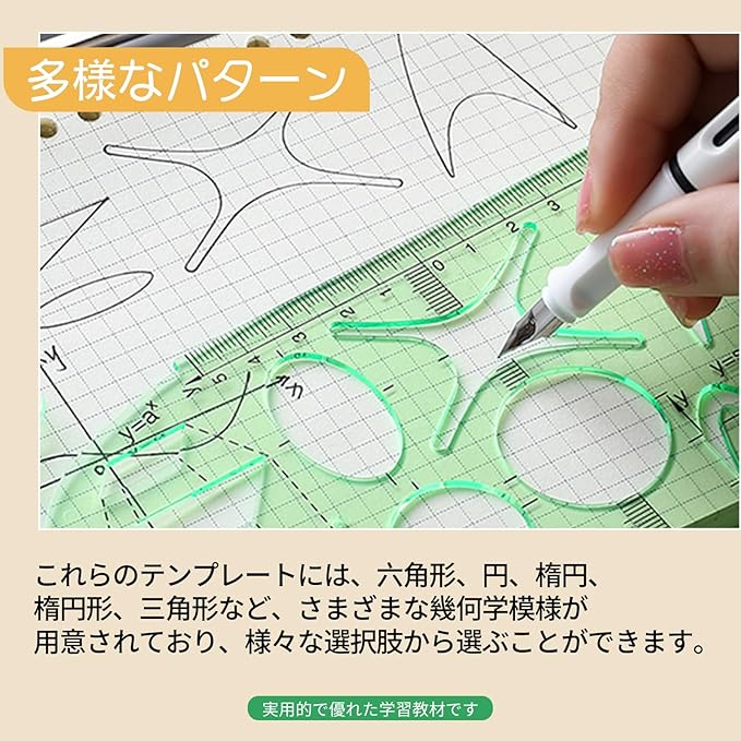 様々なパターン: 製図 テンプレート これらのテンプレートは、六角形、円形、楕円形、楕円形、三角形などの様々な選択肢に対して異なる幾何学的パターンを持ち、実用的で優れた学習補助ツールです。