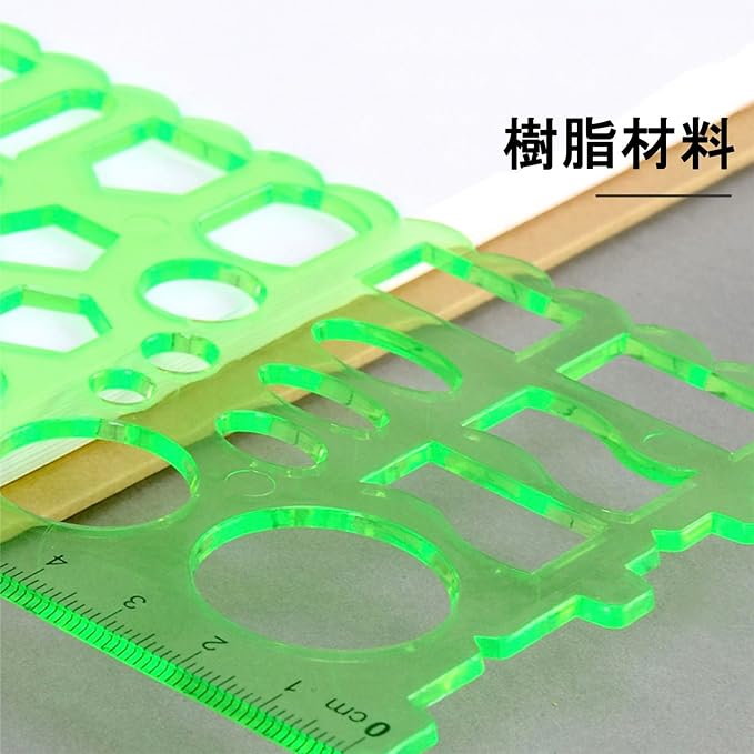 【幾何尺テンプレート】4つの緑色の幾何尺テンプレートを含み、良質なプラスチックで作られ、耐久性があり、軽量で、六角形、円形、楕円形、楕円形、三角形などの様々な形状があり、学校やオフィスで使用するのに適した異なる図案を描くことができます。