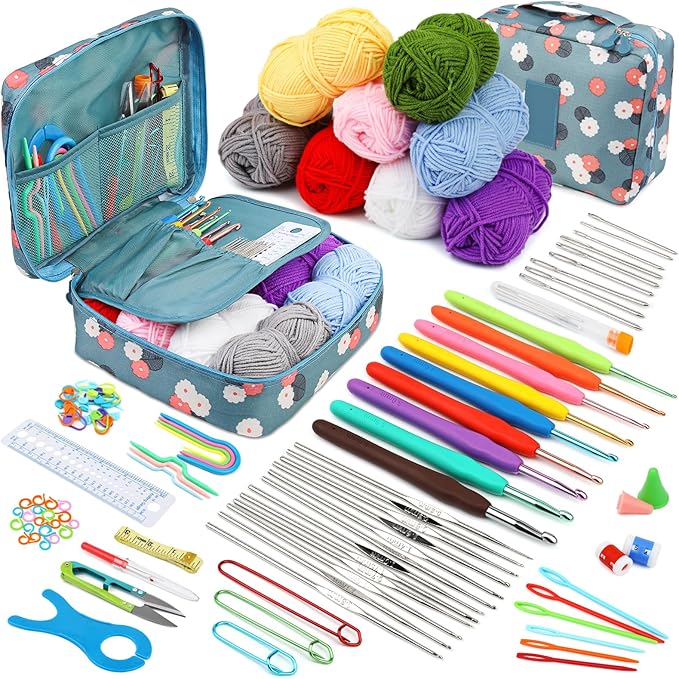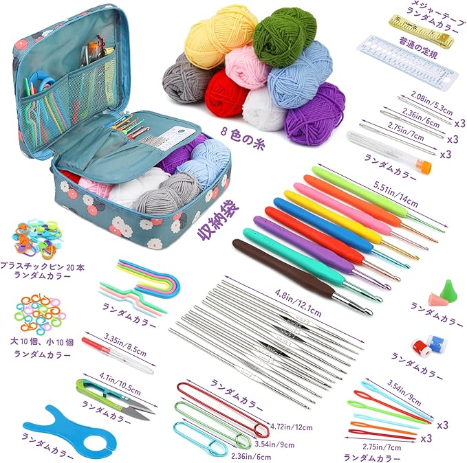 完全なかぎ針編みセット: 豊富なツールアクセサリーを提供しています。 糸ボール8個、シリコンハンドル付きアルミかぎ針9本(2.0~6.0mm)、片頭鉄かぎ針12本、鈍頭ビッグアイ針9本、プラスチック製ビッグアイ針6本、プラスチックU字型ピン4本、1本が含まれます。 巻尺、定規ゲージ 1 個、改ざん防止ピン 3 個、ニードルキャップ 2 個、小さなスプリッターナイフ 1 個、スプリットマーカーリング 20 個、プラスチックピンクラスプ 20 個、ワイヤーラップ 1 個、糸ハサミ 1 個、ツイストニードル 3 個、青い花の保存袋 1 個