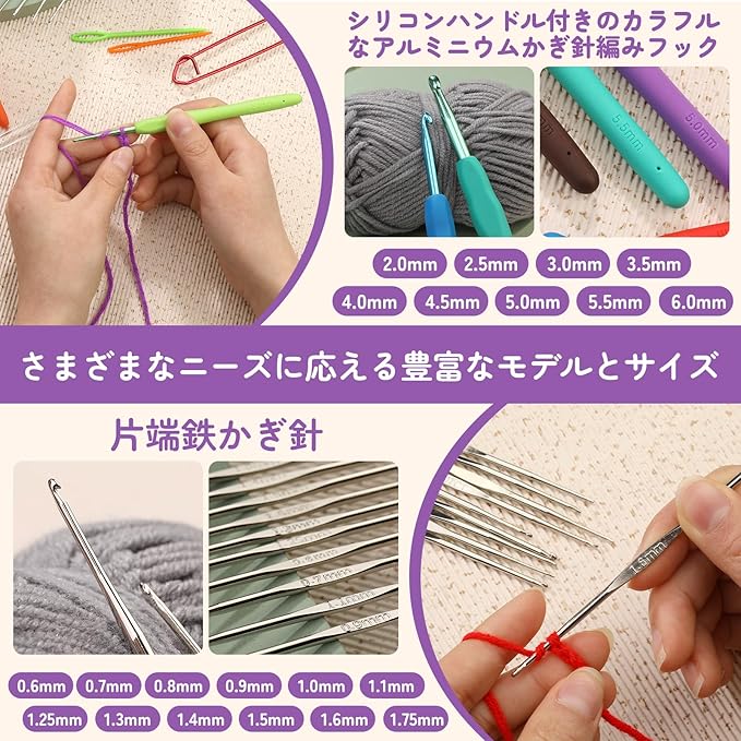 かぎ針セット: かぎ針編みフックの2つの異なる組み合わせを提供します。 さまざまな仕様のかぎ針で編み物がより快適になります。 かぎ針編みフックは、明確な文字と完全な仕様の滑り止めハンドルを使用しています。 フックヘッドの表面は磨かれて滑らかで、編み目は滑らかで引っかかりません。 長時間のかぎ針編みでも疲れません