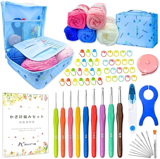 Aviria かぎ針編み 編み物 初心者 キット| 取扱説明書 解説動画つき| かぎ針9本・毛糸5色・とじ針 毛糸針・段数 目数 リング マーカー・はさみ 道具 セット|収納バッグ ケース 付き |手芸 ニット 帽子 小物 DIY あみもの|基礎 基本 入門|ハンドメイド作家監修