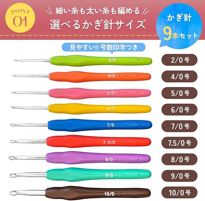 【かぎ針9本セット】2/0号,4/0号,5/0号,6/0号,7/0号,7.5/0号,8/0号,9/0号,10/0号 の9本。様々な太さの毛糸に対応。長時間編んでも疲れにくいグリップ。