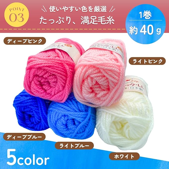 【使いやすい5カラー毛糸付き】ピンク系(ライトピンク・ディープピンク)・ブルー系(ライトブルー・ディープブルー)・ホワイトの使いやすい5色セット。1巻約40gの毛糸が付属しており、編み物を楽しめます。