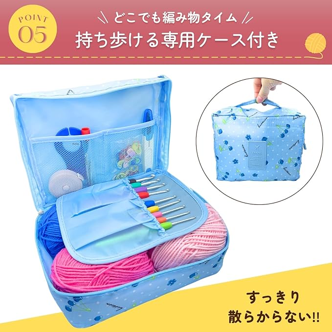 【かわいい専用収納バッグ付き】おしゃれなチェリー柄ジッパーバッグに収納。旅行や持ち運びに便利で、いつでもどこでも編み物タイムに。