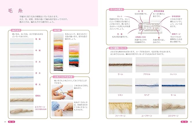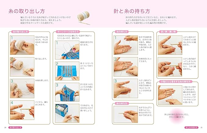 針や用具について、針と毛糸の関係性、糸の出し方、