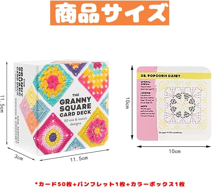 【美しいグラニースクエアデザイン】各カードには、完成したグラニースクエアのカラー写真が掲載されており、自由に並べたり組み合わせたりして、自分だけのデザインを作ることができます。カードを裏返すと、詳細なかぎ針編みの図と接続方法の説明があり、初心者でも簡単に編み始められます。