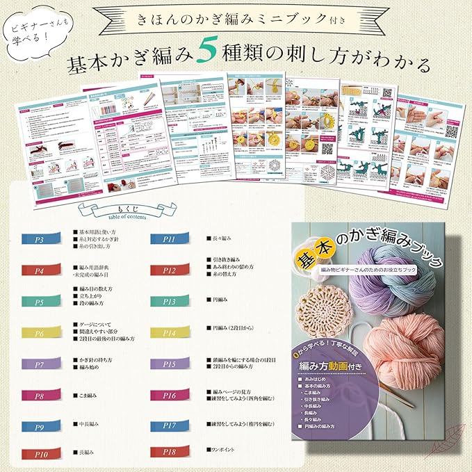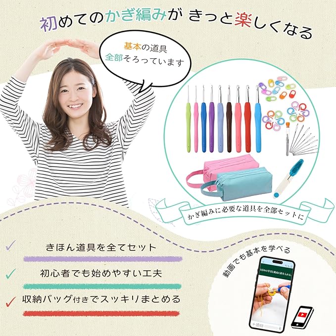 ■ 初心者にも安心!きほんの編み方ミニブック付きで練習スタート | ■ 9サイズのかぎ針で毛糸の太さに合わせて自由に選べる | ■ 収納バッグ付きで持ち運び&整理ラクラク | ■ ギフトにも最適!かわいいパッケージで贈り物にもぴったり
