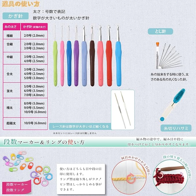 【セット内容】■ かぎ針:9本(サイズ:2 / 3 / 4 / 5 / 6 / 7 / 8 / 9 / 10)■ 段目マーカー:10個 ■ 段目リング:10個 ■ 糸切はさみ: 1個 ■ とじ針セット ■ 収納バッグ: ライトブルー 1個 ■ きほんの編み方ミニブック(図解つき)