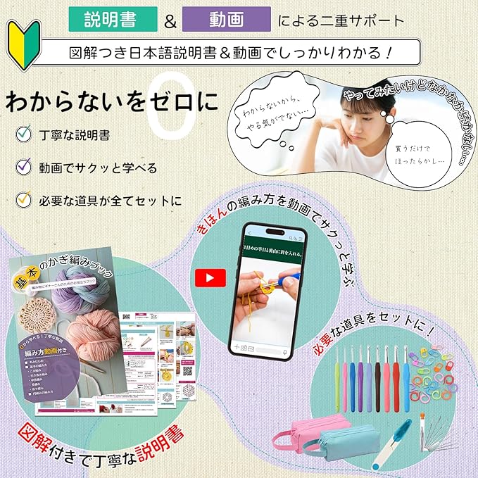 【こんな方におすすめ】◆ 初心者・編み物を始めたい方 ◆ 必要なツールをまとめて揃えたい方 ◆ 持ち運び便利な収納ケース付きセットを探している方 ◆ プレゼントやギフトにもおすすめ