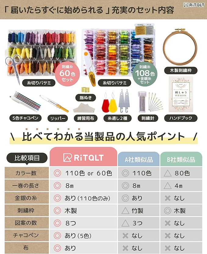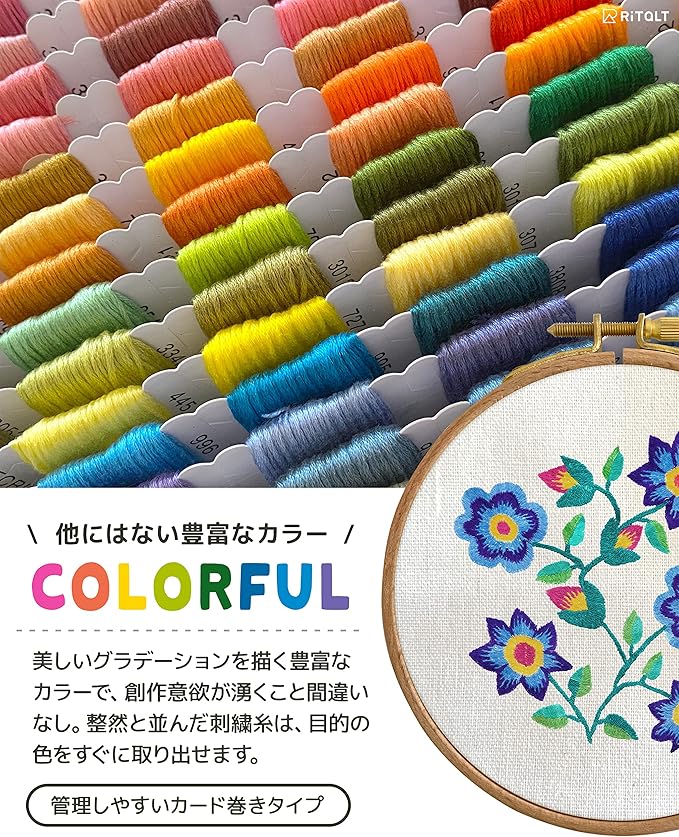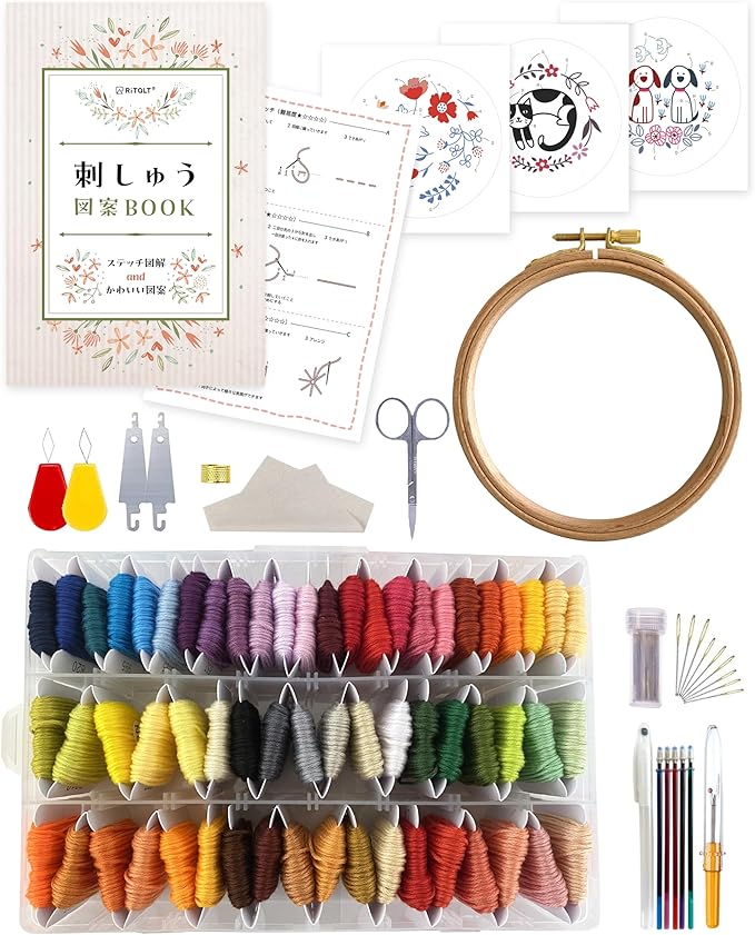 RITALT 刺繍キット 刺繍糸 60色 図案本 刺繍枠 初心者 セット 【25番/8m/6本綴り】