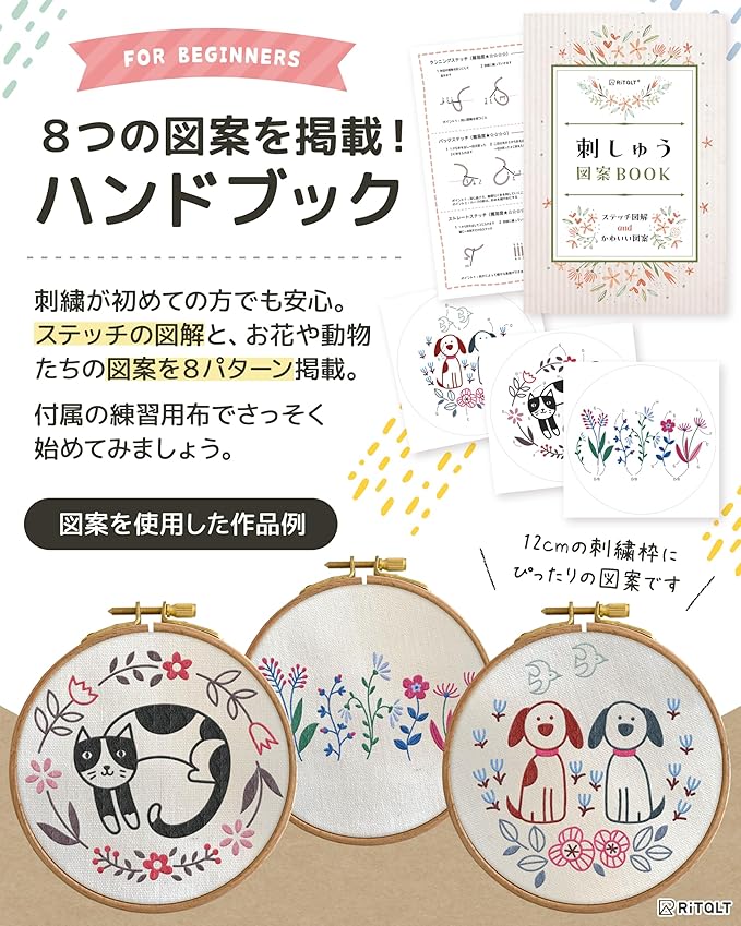 【図案付き】かわいい図案が掲載されたハンドブックをいっしょにお届けします。お花やどうぶつたちをモチーフとした図案は8パターン。12cmの刺繍枠にぴったりなサイズです。